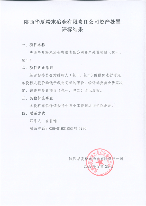 陜西華夏粉末冶金有限責(zé)任公司資產(chǎn)處置評標(biāo)結(jié)果